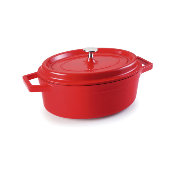 Tento oválný hrnec s rozměry 31 x 25 cm patří do kategorie větších hrnců a najde své uplatnění především v provozech, kde je důležité připravovat větší množství pokrmů s rovnoměrně rozloženou tepelnou energií. Je perfektní pro pomalé pečení ryb, pečené vepřové maso, zeleninové nákypy, ale i syté luštěninové směsi nebo tradiční kuchyni jako je svíčková či hovězí na víně. Byl vyroben z roztaveného hliníku, díky čemuž vyniká rovnoměrnou distribucí tepla – bez přepalování, bez ztráty tekutin. Hrnec tak zajišťuje, že potraviny zůstanou šťavnaté, s plným zachováním chutí, vitamínů i vůní. Vnitřní konstrukce poklice je navržená tak, aby kondenzační voda uvnitř nádoby kapala zpět na pokrm a neudržovala se na víku. Vaření s poklicí přispívá k pozvolnému zvlhčování pokrmů bez nutnosti dolévání vody či vývaru.