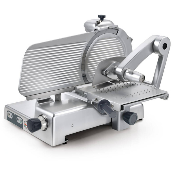 Nářezový stroj LEONARDO 350 EVO BS2 s nožem o průměru 350 mm s uložením posuvného stolu rovně.
