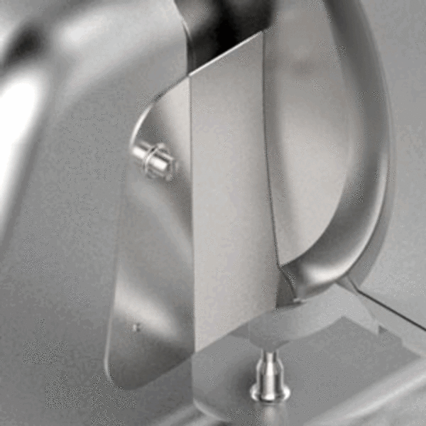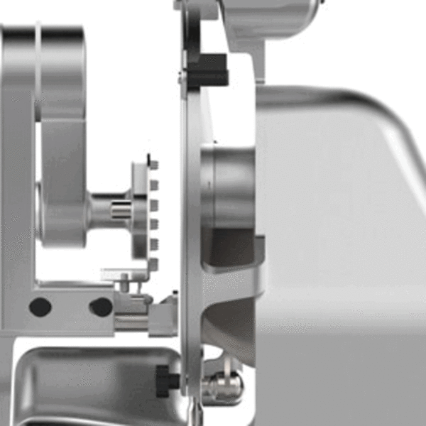 Nářezový stroj LEONARDO 370 EVO BS2 s nožem o průměru 370 mm s uložením posuvného stolu rovně.