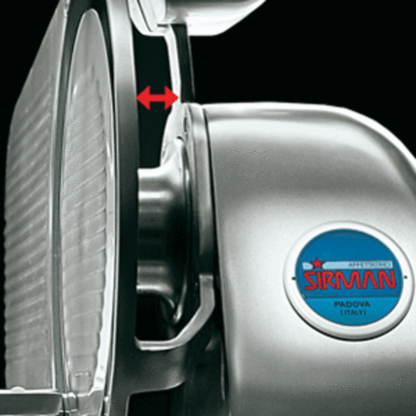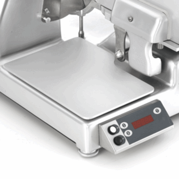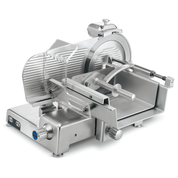 Nářezový stroj LEONARDO 370 EVO VCS TOP s nožem o průměru 370 mm s uložením posuvného stolu rovně.