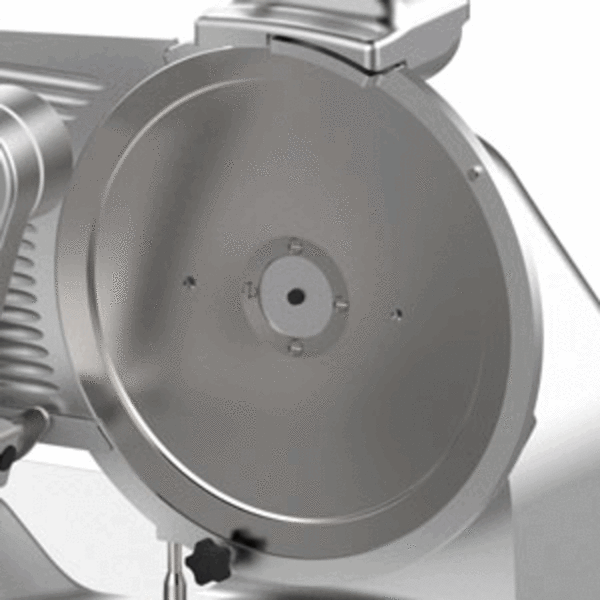 Nářezový stroj LEONARDO 385 EVO BS2 s nožem o průměru 385 mm s uložením posuvného stolu rovně.