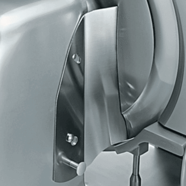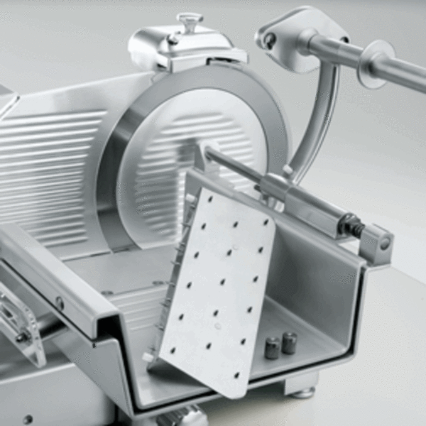 Nářezový stroj LEONARDO 385 EVO VCS TOP s nožem o průměru 385 mm s uložením posuvného stolu rovně.