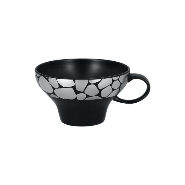 Šálek na čaj vytvořený s prvotřídní kvalitou porcelánu nechá vyniknout vaše čajová umělecká díla. Díky své stříbrné dlažbě zářící na černém pozadí působí jako okouzlující měsíc svítící na temné noční obloze. Zkrátka dodává ten správný šmrnc a luxusní atmosféru na všechny jídelní stoly.