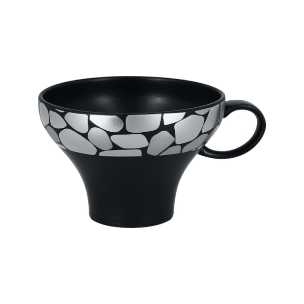 Šálek na cappuccino vytvořený s prvotřídní kvalitou porcelánu nechá vyniknout vaše kávová umělecká díla. Díky své stříbrné dlažbě zářící na černém pozadí působí jako okouzlující měsíc svítící na temné noční obloze. Zkrátka dodává ten správný šmrnc a luxusní atmosféru na všechny jídelní stoly.