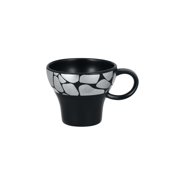 Šálek na espresso vytvořený s prvotřídní kvalitou porcelánu nechá vyniknout vaše kávová umělecká díla. Díky své stříbrné dlažbě zářící na černém pozadí působí jako okouzlující měsíc svítící na temné noční obloze. Zkrátka dodává ten správný šmrnc a luxusní atmosféru na všechny jídelní stoly.