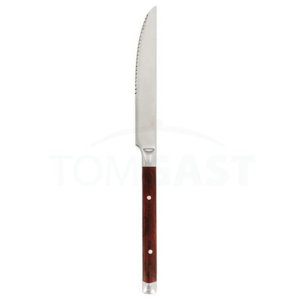 Steakový nůž z kolekce Rustic je elegantní příbor, který si najde místo v podhorských hotelech nebo country restauracích. Jeho rukojeť zdobí prvotřídní plast, který svým designem připomíná masivní dřevo, ale zároveň využívá všech výhod plastu. Nůž má také speciálně tvarovanou čepel, která ulehčuje krájení steaků. Na výrobu se používá také nerezová ocel 18/0. Ta garantuje vysokou odolnost proti korozi a zároveň slibuje dlouholetou výdrž i při každodenním používání.