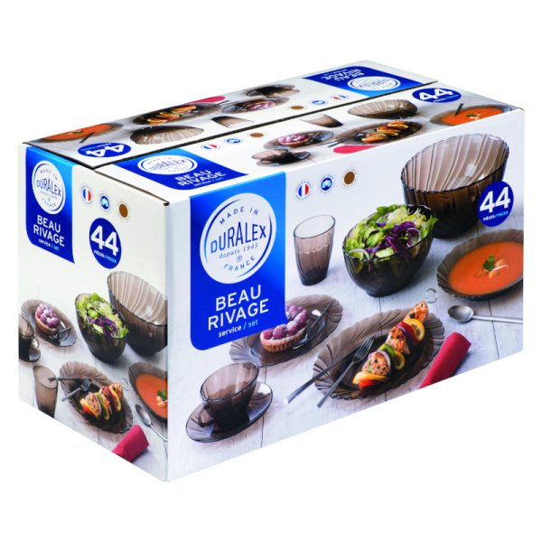 Tento skvělý set obsahující 44 skleněných kousků zajistí kompletní jídelní sadu nádobí. Svým propracovaným designem v hnědém provedení servíruje eleganci na jídelní stoly. Temperované tvrzené sklo poskytuje odolnost vůči nárazům i náhlým teplotním šokům. Nádobí lze mýt v myčkách, ohřívat v mikrovlnce i chladit v mrazničce.