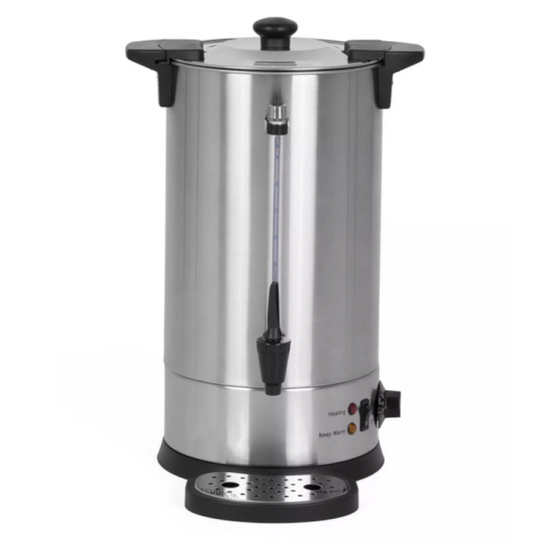 Výrobník horké vody z nerezové oceli AISI 304 s objemem 21 litrů je perfektní volbou do rušných provozů, kde potřebujete rychle ohřát velké množství vody a udržet ji stále teplou. Disponuje uzávěrem typu „Twist-Lock“ pro větší bezpečí při použití a má nekapající kohoutek, čímž zamezuje znečištění okolí. Viditelný ukazatel hladiny nápoje dává přesné informace o obsahu. Rukojeť a úchyty se nenahřívají a výrobník má možnost nastavení požadované teploty. Nechybí mu také kontrolka ohřevu a udržování teploty a funkce ohřevu a udržování teploty se automatický přepíná. Topné těleso proti zavapnění zabezpečuje to, že je umístěno pod dnem.